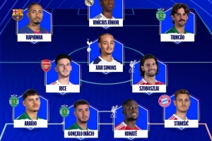 体育资讯3月20日讯 欧冠1/8决赛次回合结束了全部的争夺,欧足联官方评选出了周最佳阵,拉菲尼亚、维尼修斯、赖斯以及索博斯洛伊入选。