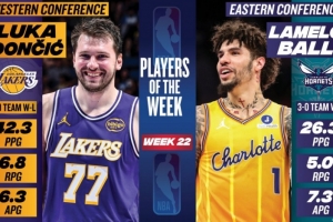体育资讯3月24日讯 今日NBA官方宣布,湖人球星东契奇和黄蜂球星拉梅洛·鲍尔分别被评为本赛季第22周西部和东部联盟周最佳球员。