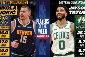 体育资讯3月31日讯 今天,NBA官方公布了25-26赛季第23周东西部周最佳球员,塔图姆和约基奇当选。